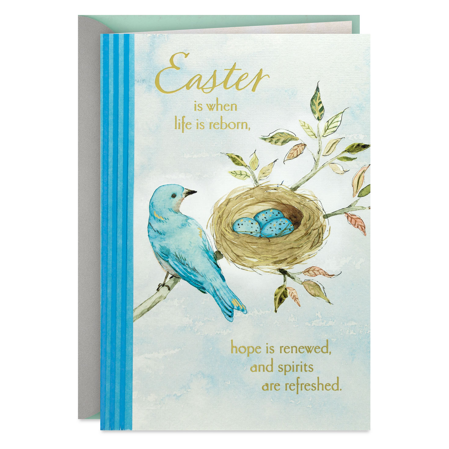 Hallmark Easter card features uplifting artwork of a blue bird on a branch and a nest of eggs against a soft gray background with stripe details and a message of grace and blessing.