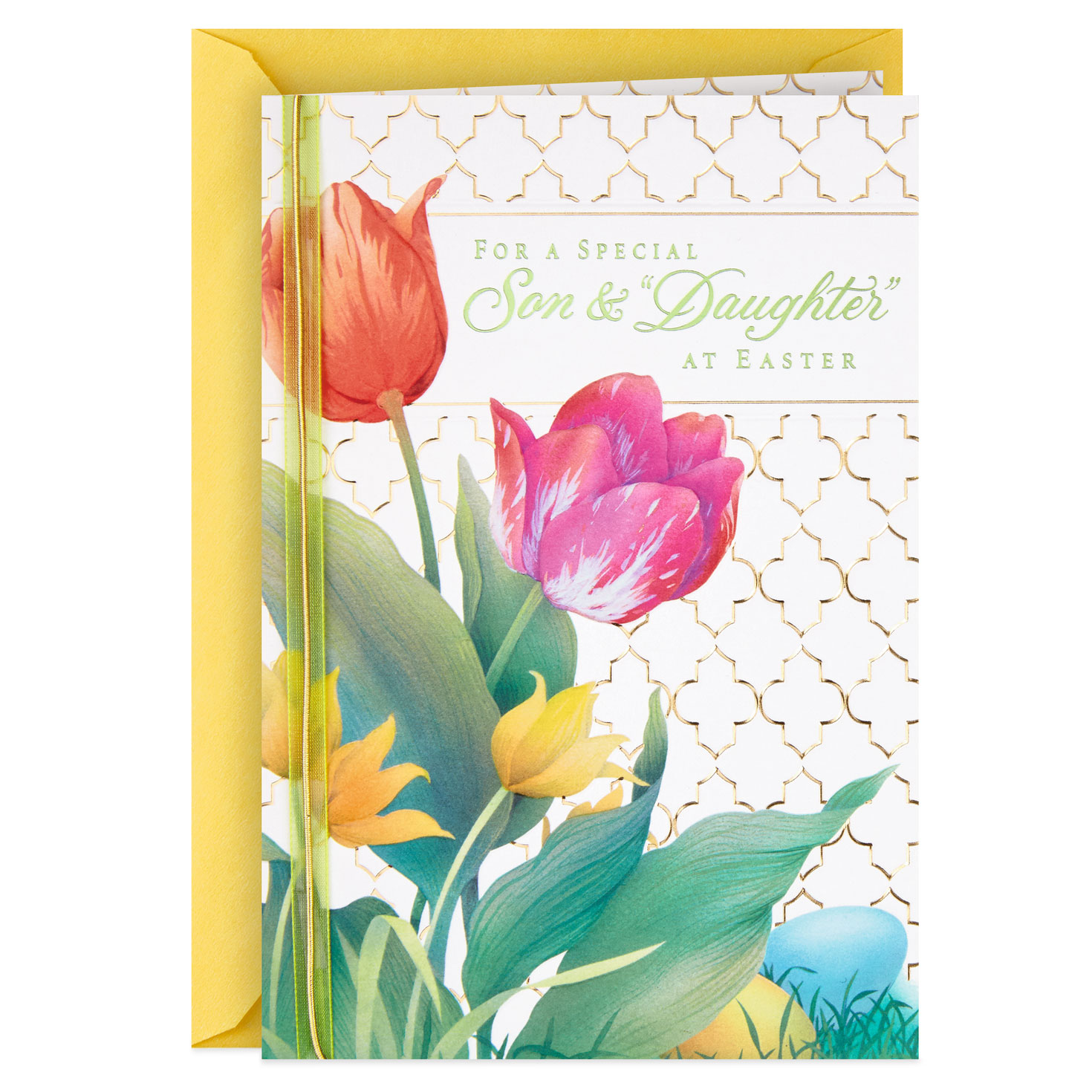 Let your son and daughter-in-law know how much they mean with this elegant Easter card featuring a vibrant floral design with a geometric pattern background in gold foil on white.